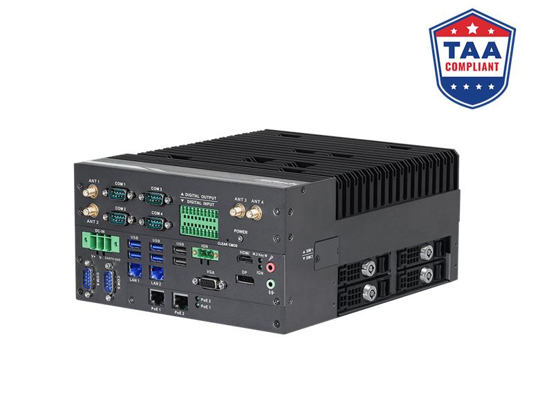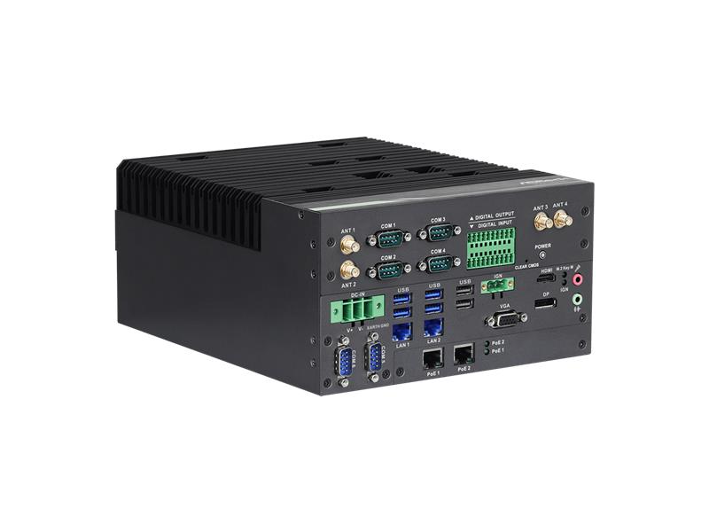 Urządzenie obsługuje 9~36V DC z funkcją Ignition Control i pełnym zestawem zabezpieczeń (OVP, UVP, OCP, polaryzacja). Konstrukcja spełnia surowe normy wstrząsów i wibracji przeyżającym MIL-STD-810H.