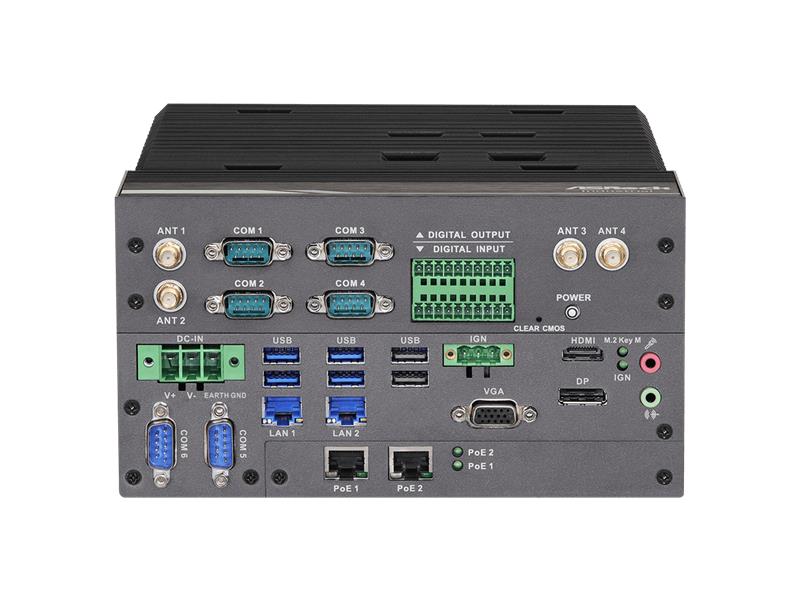 Komputer oferuje 4x 2.5GbE LAN, 6x USB (w tym 4x USB 3.2), 6x COM oraz interfejs DIO (8 DI/8 DO). Dodatkowym atutem jest podwójny slot Nano SIM (mini-PCIe + M.2 Key B) dla niezależnych modemów LTE/5G.
