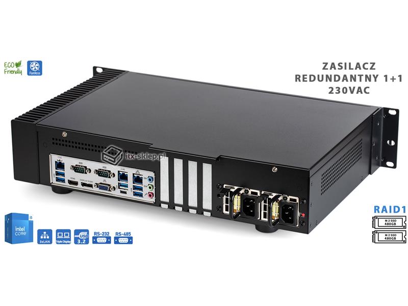 Przemysłowy komputer serwerowy 2U fanless z redundantnym zasilaczem 1+1 230 VAC i procesorem Intel Core i5-13500T