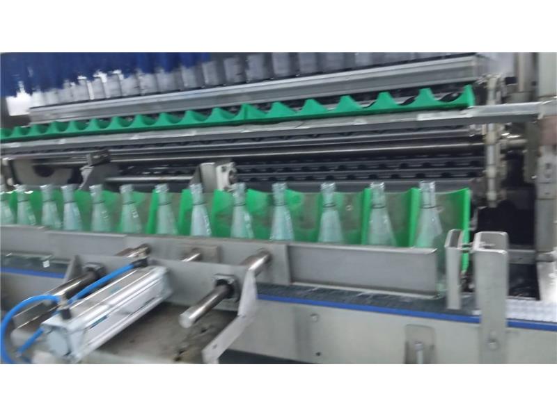 Butelki uprzednio umyte detergentem są płukane w celu całkowitego usunięcia pozostałości detergentu.