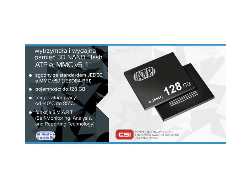 Wytrzymała i niezwykle wydajna pamięć 3D NAND Flash ATP e. MMC v5. 1 jest dedykowana do pracy w trudnych warunkach przemysłowych. Sprawdzi się w branży m.in.: transportowej, spożywczej, logistycznej czy farmaceutycznej. Pracuje w zakresie temperatur od -40°C do 85°C. Posiada technologie m.in. takie jak: AutoRefresh, Dynamic Data Refresh read disturb management czy też funkcję S.M.A.R.T (Self-Monitoring, Analysis, and Reporting Technology). Pamięć zgodna ze standardem JEDEC e.MMC v5.1 (JESD84-B51) i może posiadać do 128 GB w zależności od wybranego modelu. O niezawodności produktu świadczą również inne parametry, takie jak np.: TBW (max) do: 1320 TB, MTBF @ 25°C do: 2 000 000 h, sekwencyjny odczyt wynieść może do 300 MB/s, a zapis do 240 MB/s. Random Read/Write (IOPS) to: 15K/30K. Jest niewielkich wymiarów (mniejszych niż znaczek pocztowy); mierzy zaledwie 11.5 mm x 13.0 mm x 1.3 mm co stanowi zdecydowany atut w sytuacji, gdzie użytkownik dysponuje niewielką ilością miejsca, aby umieścić pamięć.